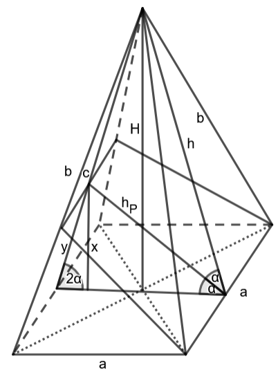 Oblicz pole przekroju otrzymanego z przecięcia tego ostrosłupa płaszczyzną przechodzącą przez krawędź podstawy i nachyloną do podstawy pod kątem