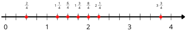 Zaznaczając punkt na osi, zwróć uwagę na liczbę przed ułamkiem – ta liczba powie Ci, za którą liczbą oznaczoną na osi powinien się znajdować punkt, a później na licznik ułamka – ta liczba powie Ci, na której dokładnie kresce powinniśmy zaznaczyć dany punkt.