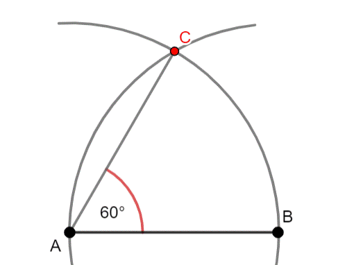 W tym zadaniu na początku narysuj odcinek |AB| dowolnej długości, następnie wbij cyrkiel w punkt A i narysuj łuk o szerokości odcinka |AB|–to samo zrób dla punktu B. Punkt przecięcia łuków oznacz literką C, a następnie narysuj odcinek |AC|. Ramię |AC| jest nachylone do odcinka |AB| pod kątem 60°.