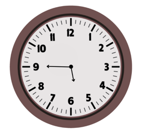 Krótsza wskazówka pokazuje godzinę, jest 45 minut po godzinie 5, więc wskazówka znajduje się między 5 a 6.