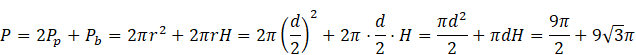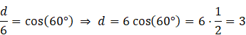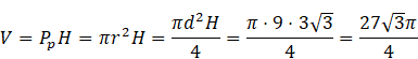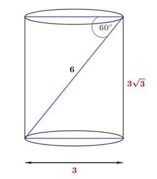 Z zależności trygonometrycznych wyznacz długość średnicy okręgu (d) oraz wysokość walca (H). Następnie określ jego pole całkowite (P) oraz objętość (V).