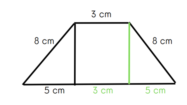 Zawsze przed rozpoczęciem takiego zadania narysuj rysunek pomocniczy. Ułatwia to wykonywanie obliczeń i zrozumienie zadania. Pamiętaj, że trójkąt równoramienny ma ramiona równej długości, więc zarówno ramię po prawej, jak i to po lewej mają 8 cm. Przez trapez poprowadzono czarną wysokość. Poprowadź taką samą przy trójkącie z prawej strony. Łatwo wtedy zauważyć, że tworzyły się dwa trójkąty prostokątne o tych samych wymiarach.