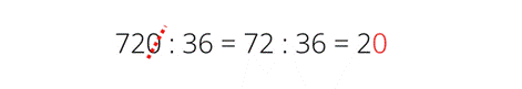 720 : 36 – w tym działaniu możemy najpierw podzielić liczbę 72 przez 36, a następnie do wyniku dodać zero po prawej stronie: