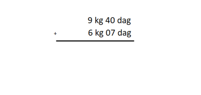 W tym zadaniu musisz dobrać sumę do podanego wyrażenia zapisaną pisemnie: 9 kg 40 dag + 6 kg 7 dag.