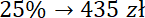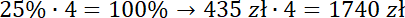 Zauważ, 25% jest 4 razy mniejsze od 100%, więc cena wczasów jest 4 razy większa od wartości zaliczki. Wykonaj mnożenie.
