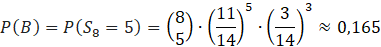 W tym zadaniu musisz obliczyć prawdopodobieństwo wylosowania co najmniej jednej kuli białej 5 razy, jeśli 8 razy powtarzamy doświadczenie polegające na wylosowaniu z urny 3 kul i odłożeniu ich z powrotem, jeśli w urnie jest 6 kul białych i 10 czarnych.