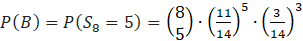 B — zdarzenie: wylosowano co najmniej 1 białą kulę 5 razy