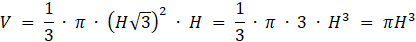 W tym zadaniu musisz obliczyć objętość stożka, który wpisano w walec o wysokości H w taki sposób, że podstawa stożka jest podstawą walca, a wierzchołek stożka jest środkiem drugiej podstawy walca, przy czym pola powierzchni bocznych walca i stożka są równe.