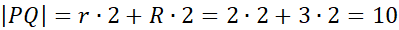 Dwa okręgi styczne zewnętrznie mają jeden punkt wspólny, który wraz ze środkami okręgów leży na jednej prostej. Odcinek PQ ma długość sumy długości średnic obu okręgów. Oblicz tę długość.