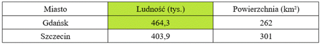 Na początku musisz zapoznać się z danymi. Następnie musisz wskazać tę część tabeli, która informuje o ludności Gdańska, a potem zapisać tę informację bez używania jednostki zwielokrotnionej (w tym przypadku bez tysięcy).