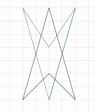 Narysuj przykładowy czworokąt wklęsły (kolor czarny) i jego odbicie symetrycznego względem wybranego punktu wewnątrz tej figury (kolor zielony).