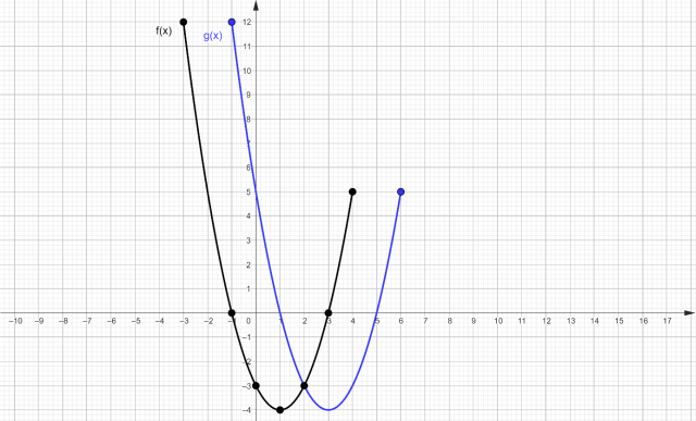 Dana jest funkcja f(x) = (x – 1)2 – 4, której dziedziną jest ⟨-3; 4⟩, narysuj ją oraz wykres funkcji g(x) = f(x – 2).