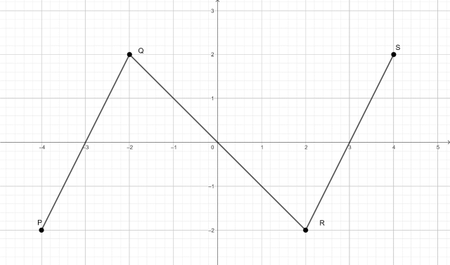 Narysuj wykres funkcji f poprzez połączenie kolejno odcinkami punkty P(-4, -2); Q(-2, 2); R(2, -2); S(4, 2), a następnie dla tego wykresu zapisz przedziały, w których funkcja f przyjmuje wartości ujemne.