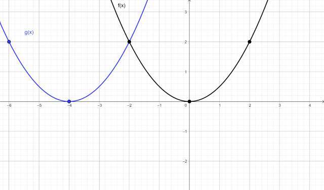 Wykonaj tabelkę, na górze podaj liczbę, którą podstawisz za x, aby wyliczyć y. Dzięki temu wyznaczysz współrzędne punktów, należących do wykresu funkcji f(x). Zaznacz te punktu i połącz je ze sobą. Narysuj wykres g(x) poprzez przesunięcie wykresu f(x) o 4 w lewo. Następnie wyznacz miejsca zerowe funkcji g(x).