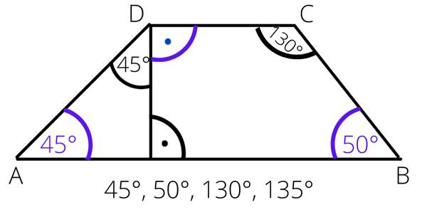Trójkąt po lewej, zawierający się w trapezie, jest równoramienny. Suma kątów przy jednym ramieniu trapezu zawsze jest równa 180°.