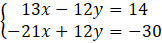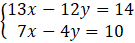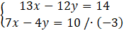 Na początku tego zadania musisz przemnożyć drugie równanie przez pewną liczbę tak, aby liczby stojące przy niewiadomej y w obu równaniach były sobie przeciwne. Następnie musisz dodać oba równania do siebie stronami. Niewiadome y zredukują się ze sobą. Musisz rozwiązać równanie z jedną niewiadomą. Po wyliczeniu wartości x musisz podstawić ją do dowolnego równania, a następnie rozwiązać to równanie, aby wyznaczyć wartość y.