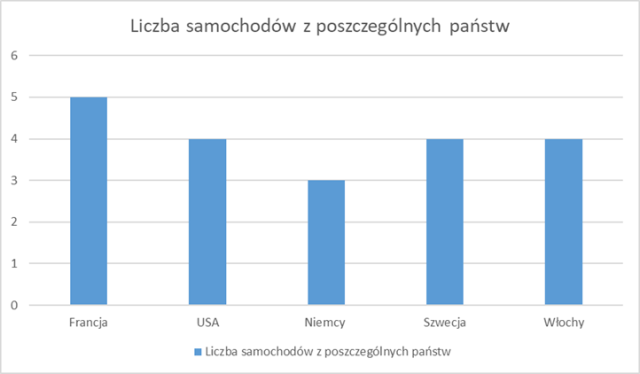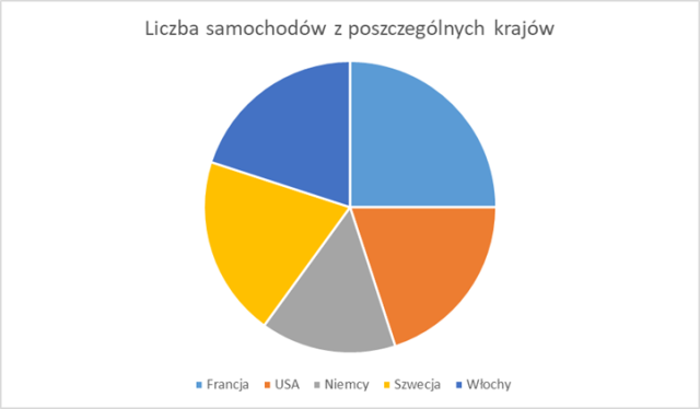 Najpierw policz, ile samochodów pochodzi z jakiego kraju. Przedstaw dane na wykresie słupkowym i kołowym. Aby narysować wykres kołowy, oblicz, jakim procentem wszystkich samochodów są samochody z danego kraju i oblicz ile stopni stanowi dany procent samochodów, aby móc odmierzyć taką wartość rysując diagram kołowy.