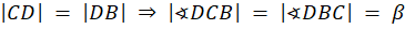 Skorzystaj z sumy kątów wewnętrznych w trójkącie ACD, aby policzyć miarę kąta α. Następnie oblicz miarę kąta CDB oraz zauważ, że trójkąt CDB jest równoramienny, więc kąty przy wierzchołkach C i B wynoszą β.