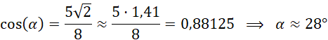 Wyznacz miarę szukanego kąta, korzystając z funkcji cosinus, która jest stosunkiem długości przyprostokątnej leżącej przy kącie do długości przeciwprostokątnej. Następnie odczytaj przybliżoną miarę tego kąta z tablic trygonometrycznych.