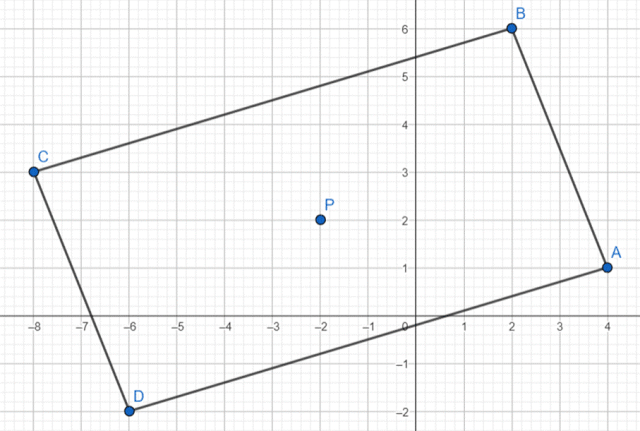 , wiedząc, że punkt D jest czwartym z wierzchołków równoległoboku ABCD, a punkt P jest punktem przecięcia przekątnych w tym równoległoboku. Dane są punkty