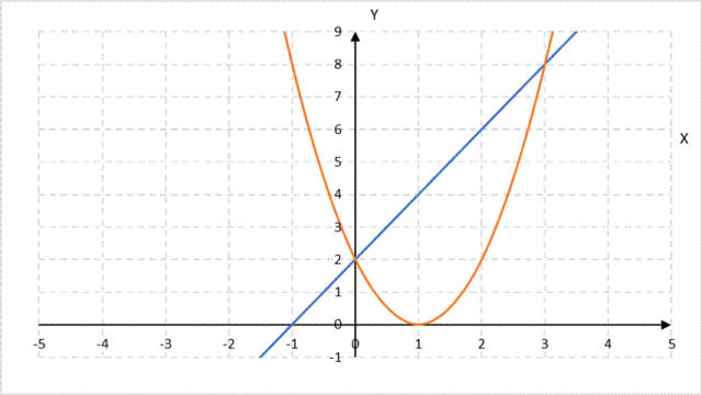 Punkt przecięcia to (0, 2) oraz (3, 8).