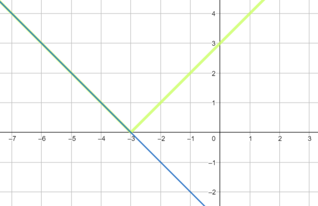 Aby rozwiązać równanie, przekształć je do postaci |x + 3| = -x – 3 (tak by łatwiej było narysować wykresy). Następnie naszkicuj wykresy funkcji y = |x + 3| - kolor zielony oraz y = -x - 3 – kolor niebieski. Rozwiązaniami są argumenty, dla których wykresy funkcji się pokrywają.