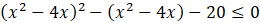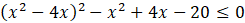 Aby rozwiązać nierówność wprowadź zmienną pomocniczą t = x2 – 4x. Następnie rozwiąż otrzymaną nierówność kwadratową. Wyznacz warunki, które musi spełniać t, a następnie wróć do podstawienia za x. Otrzymasz w ten sposób koniunkcję dwóch nierówności kwadratowych, których iloczyn rozwiązań jest odpowiedzią do zadania.