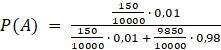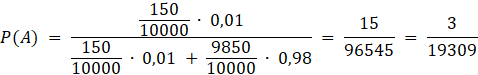 W tym zadaniu musisz obliczyć prawdopodobieństwo zdarzenia, że losowo wybrana osoba jest chora, jeśli test wykluczył u niej chorobę, a test wskazuje dobry wynik w 99% przypadków dla osób chorych i w 98% przypadków dla osób zdrowych, a w tym regionie średnio 150 na 10 000 osób jest chorych na tę chorobę.