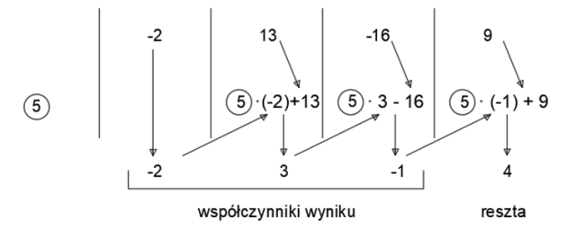 (-2x3 + 13x2 – 16x + 9) : (x – 5) = -2x2 + 3x – 1 reszta 4