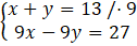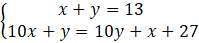 Pierwsze równanie w układzie równań to suma cyfry dziesiątek i jedności, drugie to suma pomnożonej przez 10 cyfry dziesiątek i cyfry jedności oraz pomnożonej przez dziesięć cyfry jedności, cyfry jedności oraz 27. Obliczamy x i y i podstawiamy tworząc liczbę.