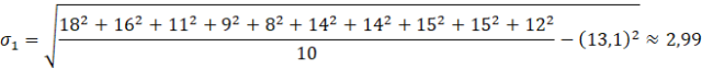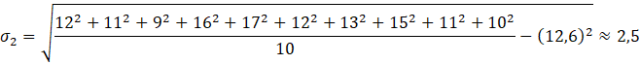 Obliczamy odchylenie standardowe, sumując kwadraty wszystkich wartości ze zbioru, dzieląc je przez ich ilość, odejmując kwadrat średniej arytmetycznej (obliczony w podpunkcie a)) i całość pierwiastkując.