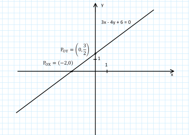 W tym zadaniu musisz ustalić jakie współrzędne mają punkty przecięcia się prostej 3x – 4y + 6 = 0 z osiami OX i OY, a następnie masz narysować tę prostą.