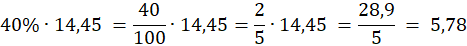 Następnie wylicz, ile wynosi 40% wyniku (czyli 14,45) . W tym celu pomnóż 40% przez 14,45 (w tym celu 40% możesz zamienić na ułamek