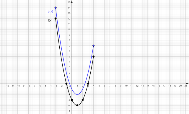 Wykonaj tabelkę dla funkcji f(x) = (x – 1)2 – 4, aby wyznaczyć punkty, które są potrzebne do narysowania jej. Po narysowaniu wykresu funkcji f(x), narysuj wykres funkcji g(x) poprzez przesunięcie wykresu funkcji f(x) o 2 jednostki w górę.