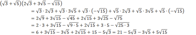 Kiedy mnożysz nawiasy przez siebie, musisz wymnożyć każdy wyraz jednego nawiasu przez każdy wyraz drugiego nawiasu. Jeśli powstałe wyrazy składają się z pierwiastków z tą samą liczbą pod pierwiastkiem to możesz je dodać do siebie, aby uprościć wyrażenie.