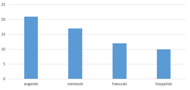 W pewnej szkole zapytano grupę 30 uczniów, jakich języków obcych się uczą. Spośród tych uczniów, 21 wskazało język angielski, 17 osób wybrało niemiecki, 12 osób wybrało francuski, a 10 osób wybrało hiszpański. Przedstaw te dane na diagramie słupkowym.
