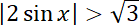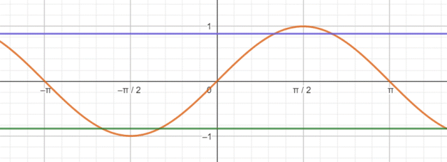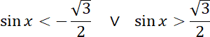 Aby rozwiązać nierówność, zacznij od opuszczenia symbolu wartości bezwzględnej. W tym celu rozbij nierówność na alternatywę dwóch nierówności. Następnie rozwiąż je, korzystając z wykresu funkcji sinus.