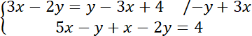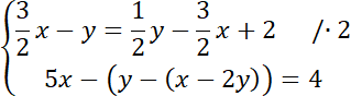 Każde z równań przedstaw w najprostszej postaci. Zauważ, że całe drugie równanie należy pomnożyć przez (-1), aby współczynniki były przeciwne. Następnie dodaj do siebie stronami oba równania znajdujące się w układzie.