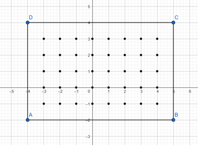 Punkty A, B, C, D zaznacz w układzie współrzędnych i połącz je ze sobą tak, aby powstał prostokąt ABCD. Następnie ustal, ile punktów kratowych, czyli takich których obie współrzędne są liczbami całkowitymi znajduje się wewnątrz niego.