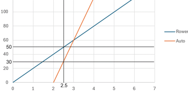 Naszkicuj w jednym układzie współrzędnych zależność liczby przejechanych kilometrów przez każdy z pojazdów od czasu, jaki upłynął od rozpoczęcia podróży przez pierwszy z nich, jeśli z miasta A o godzinie 8.00 wyjechał rowerzysta poruszający się z prędkością 20 km/h, a dwie godziny później z tego samego miasta i w tę samą stronę wyjechał samochód, który poruszał się z prędkością 60 km/h. Na podstawie wykresu ustal jaki dystans dzielił rowerzystę i samochód o godzinie 10.30.