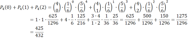 Wyznacz prawdopodobieństwo otrzymania co najwyżej dwóch szóstek podczas czterokrotnego rzutu kostką.