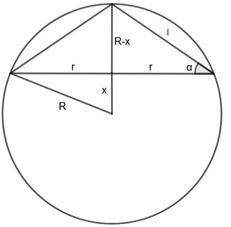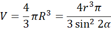 Skorzystaj z twierdzenia sinusów w trójkącie przedstawionym na rysunku dla kąta pomiędzy tworzącymi stożka i z powstałego równania wyznacz promień kuli, a następnie jej objętość.