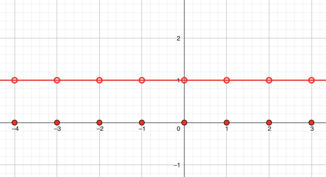 W tym zadaniu musisz narysować wykres funkcji, która każdej liczbie całkowitej k przyporządkowuje liczbę -1, a każdej liczbie niecałkowitej – liczbę 1, a podaj wzór tej funkcji.