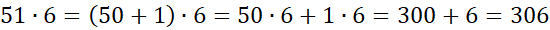 Liczbę 51 zapisujemy jako sumę 50 + 1. Następnie mnożymy 50 przez 6 oraz 1 przez 6. Na koniec dodajemy otrzymane wyniki.