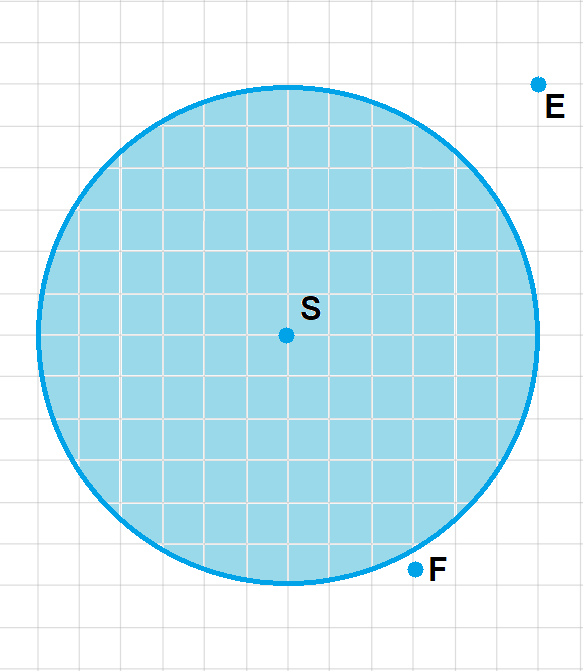 Promień okręgu ma długość równą połowie długości średnicy, a więc 3 cm. Rozstaw nóżki cyrkla na szerokość 3 cm i zakreśl okrąg. Punkty, których odległość od punktu S jest większa niż długość promienia koła, to wszystkie punkty, które leżą poza kołem.