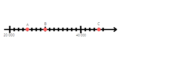 Jest 15 punktów dzielących odległość między 20 000 a 40 000 na 16 równych części, więc musimy 40 000 – 20 000 = 20 000, wystarczy 20 000 : 16 = 1250. Nasza jednostka (jedna kratka) to 1250.