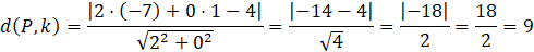 W tym zadaniu musisz obliczyć odległość punktu P od prostej k, wiedząc, że P(-7, 1), k: 2x - 4 = 0.
