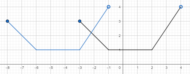 Wykres funkcji y = f(x + 5) jest zaznaczony kolorem niebieskim.