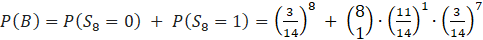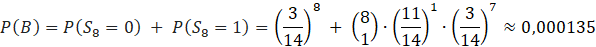 W tym zadaniu musisz obliczyć prawdopodobieństwo wylosowania co najmniej jednej kuli białej co najwyżej raz, jeśli 8 razy powtarzamy doświadczenie polegające na wylosowaniu z urny 3 kul i odłożeniu ich z powrotem, jeśli w urnie jest 6 kul białych i 10 czarnych.