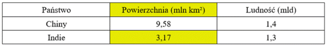 Na początku musisz zapoznać się z danymi. Następnie musisz wskazać tę część tabeli, która informuje o powierzchni Indii, a potem zapisać tę informację bez używania jednostki zwielokrotnionej (w tym przypadku bez milionów).